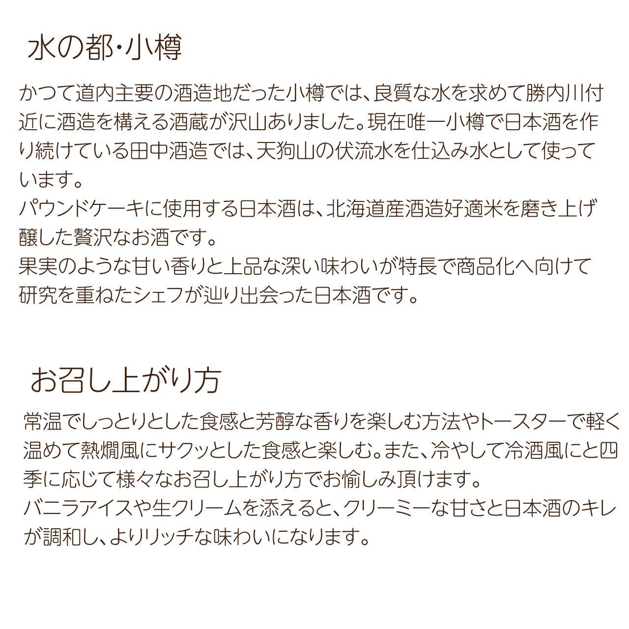 大吟醸の贅沢な甘さと風味が楽しめる小樽地酒を使用したパウンドケーキ!