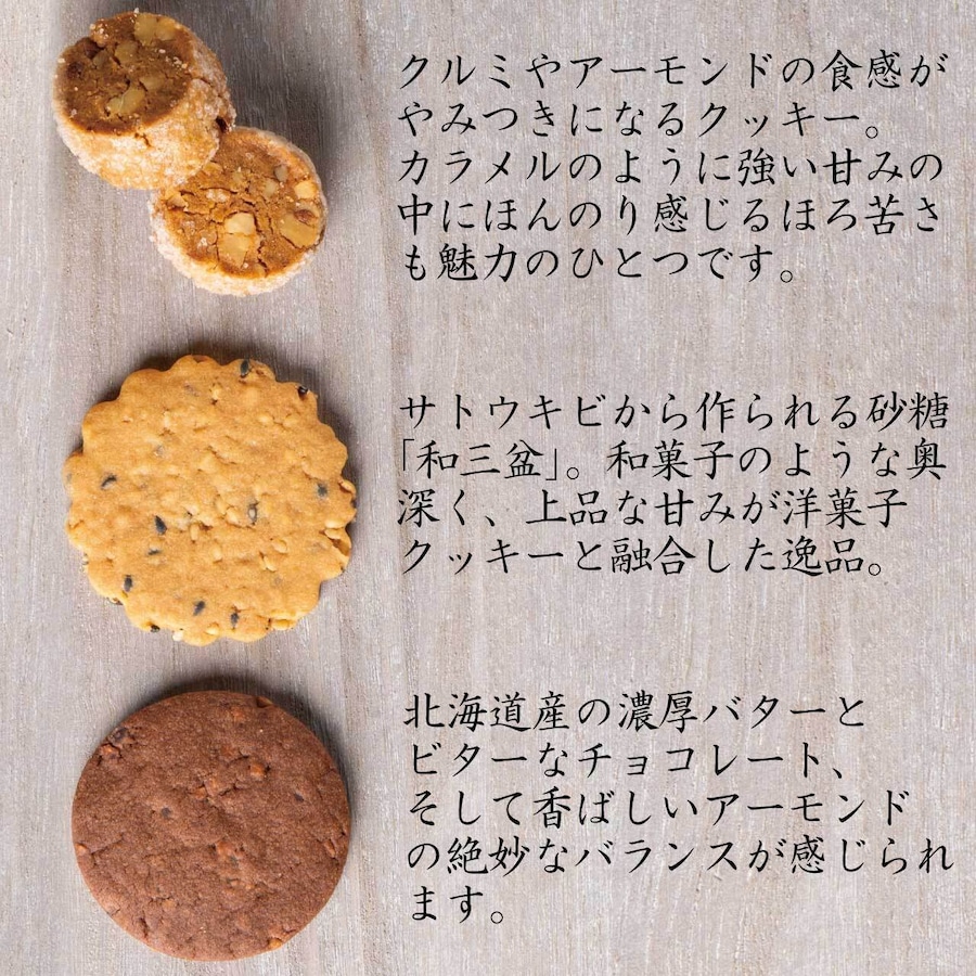 小麦粉(北海道産)、バター(国内製造)、胡麻(白胡麻・黒胡麻)和三盆糖、グラニュー糖、卵白、食塩(一部に小麦・卵・乳成分・胡麻を含む)
